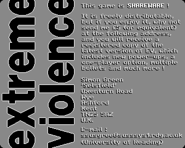 Extreme Violence is a Shareware Duel Action game, developed and published by Simon Green, which was released in Europe in 1992. Game is now a Freeware.