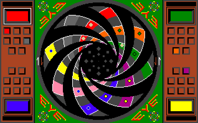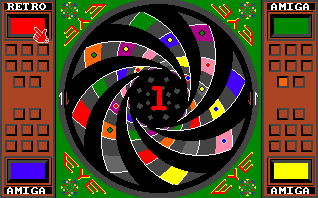 Eye is closely based on the board game with the same name. The game is played with two to four players on a board with differently coloured squares. Each player has playing stones of one colour and the goal to get a certain amount of the own stones on the corresponding fields. The spin on this concept is that the board is placed on two rotatable spirals which change the square distribution on the field when used. During each turn, a player has a different amount of moves available (changes depending on the current match situation); each move consisting of moving a square or turning a spiral. This computer version also allows some rule modifications in comparison to the original game and all opponents can be replaced by the AI.