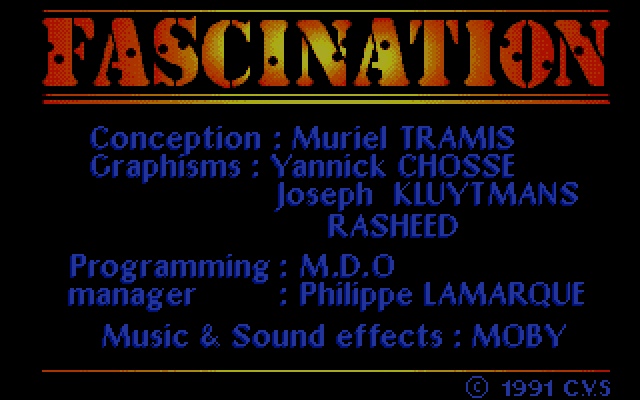 Fascination is a mature-themed adventure. The game is about a business man who has invented a chemical drug that increases the sex-drive. Unfortunately he was assasinated, and you accidentally get hold of the drug sample. Your mission is to try to deliver the sample to the right person and avoid being made out as the murderer.