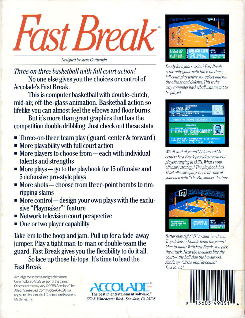 | __long_description | Fast Break is an action/strategy basketball game for one or two players. You play three on three (guard, center, and forward) on the whole court with 3, 6, 9, or 12 minute quarters. At the start of the game you can customize your team by choosing from a variety of different players, each with their own strengths and weaknesses. Included are 14 different plays you can use during the game along with the playmaker which lets you design your own plays. Players can be substituted or the playbook modified by calling timeouts or waiting for the end of a quarter. |