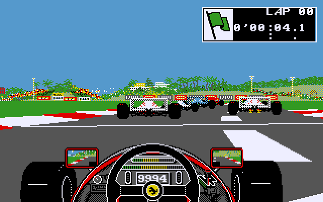 You can jump straight into the races however, either as one-offs or a full championship season. Races can last from 18km to the full 300+km distance, with all the practice and qualifying sessions. Car setup at the track involves selecting wing settings, tyre compounds, fuel usage (important in the days of turbocharged engines) and the like. The action is viewed from inside the cockpit, with rear-view mirrors to help prevent collisions.