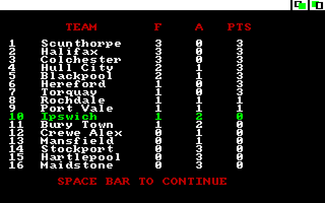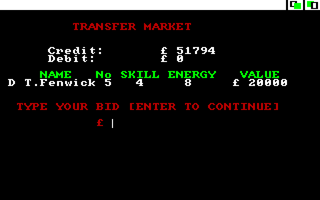 The football management game style has been one of the most enduring since Kevin Toms pioneered it in 1982. You start in the 4th division with the team of your choice, and can play on indefinitely in the hope of reaching the top division and dominating it, as well as winning the cups. Players can be bought or sold, with their transfer values varying according to the size of any bid. Their skills and morale vary as the season goes on, with resting key players in easy matches often a key move. You can take out a loan, limited depending on your division, while day-to-day bills must be covered. Matches feature short animated highlights sequences of key moments