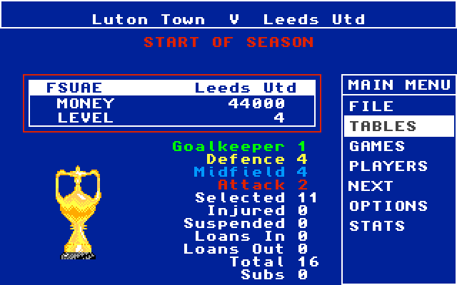 Football Masters is a football management simulation from ESP Software. The game allows the player to control a team from the four English divisions. Very easy to pick up and play with no fancy graphics, just a simple clock counting up and goal, cards and injuries highlighted.