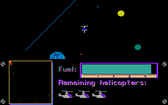 | __long_description | A hostile power station has been discovered in a huge underground cavern. Your mission is to destroy it. Your battle chopper is equiped with a cannon and a limited supply of fuel. As you navigate the maze-like cavern avoid the bad guys shooting at you and head for the nearest way-point where you can rest for a minute, save your game and refuel your helicopter. |