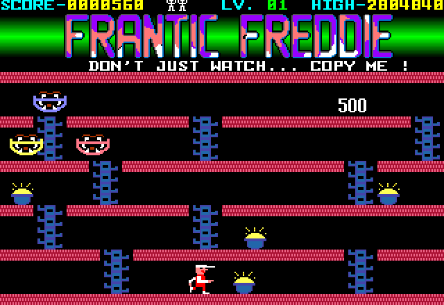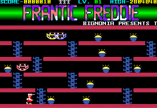 From the people who brought you that excellent version of Donkey Kong a couple of months back comes Frantic Freddie, yet another platform game. If anything (and some may find this hard to believe) it's even simpler than Kong. Hero Freddie has to be manoeuvred around the network of platforms and ladders whilst picking up the goodies and avoiding the roving nasties. Not so bad, eh? Ah, but the twist here is that Freddie can't walk through the ladders, so if he's not careful it's very easy for him to get trapped in a dead-end. However, that aside, that's pretty much all there is to say.