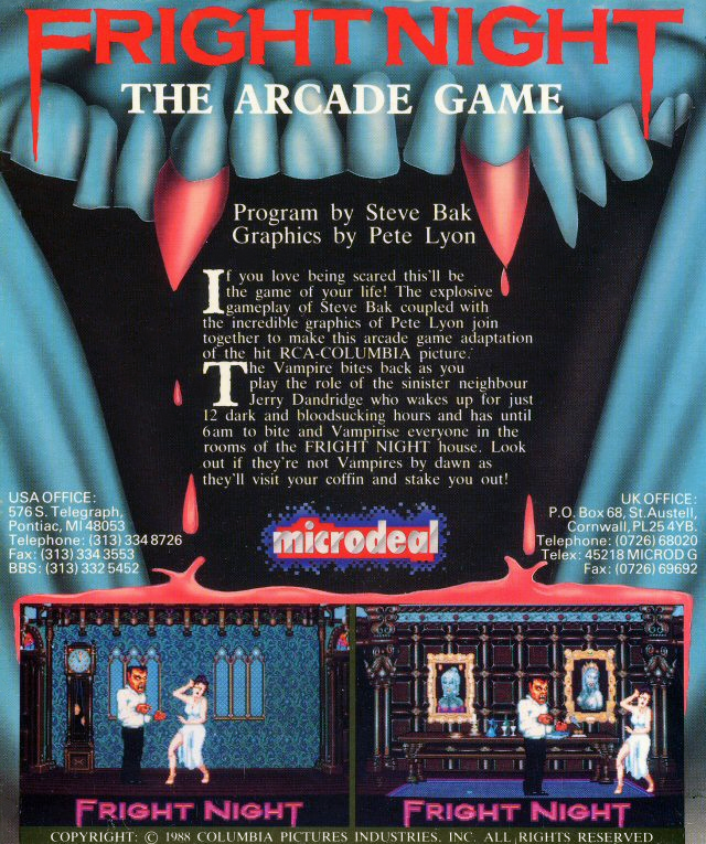 | __long_description | Fright Night is based on the 1985 Columbia Pictures movie of the same name. You play vampire Jerry Dandridge in this arcade-style action game. You prowl the rooms of the mansion searching for victims. You have to dodge the Crucifixes thrown at you and sink your teeth into anything that looks tasty. Once you've drained the blood of all your victims, you can proceed to the next level. Keep an eye out for the unhealthy as they will drain your lifeforce; too much bad blood and you're a dead vampire. You can run back to your coffin if you're low on health to regenerate, as well, you must be back in your coffin before the sun comes up, or you're a toasty vampire. |