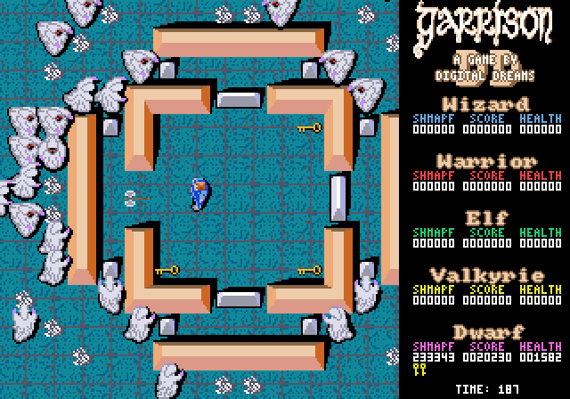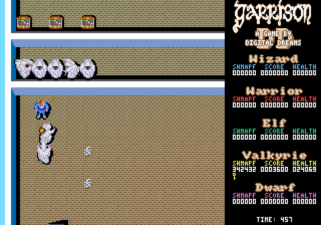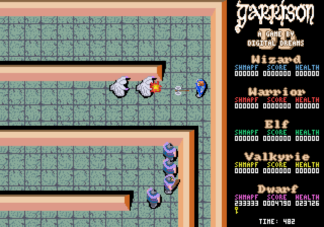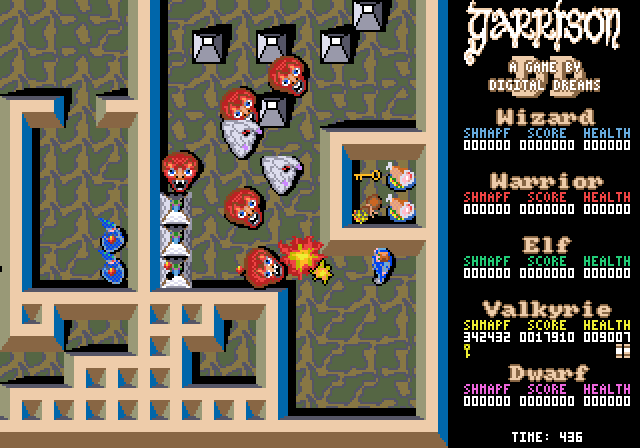 Up to five characters fight their way through over 100 dungeon levels taking on hordes of enemies, collecting potions, gold, scrolls, keys and magic items along the way. Each player character has different strengths and weaknesses so the game plays best in multiplayer mode because some levels really benefit from particular capabilities eg. speed or magic. The enemies also have a large variety of attacks, some fire projectiles at you, some engage you in hand to hand combat, some just drain your health when they touch you and some attack you with magic.