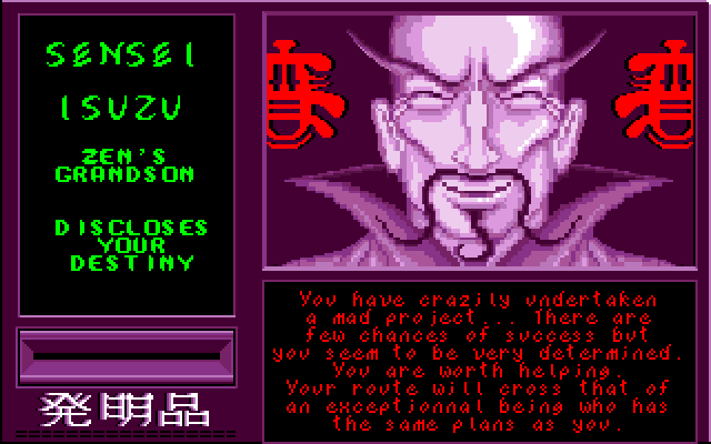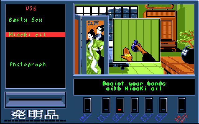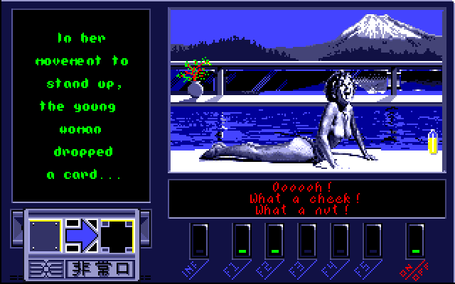 Geisha is an erotic adventure game. A mad scientist kidnapped the protagonist's girlfriend Eva, and wants to transform her into some sort of a futuristic geisha (half-machine, half-human). The hero travels to Tokyo and must face various dangers to prevent this from happening.
