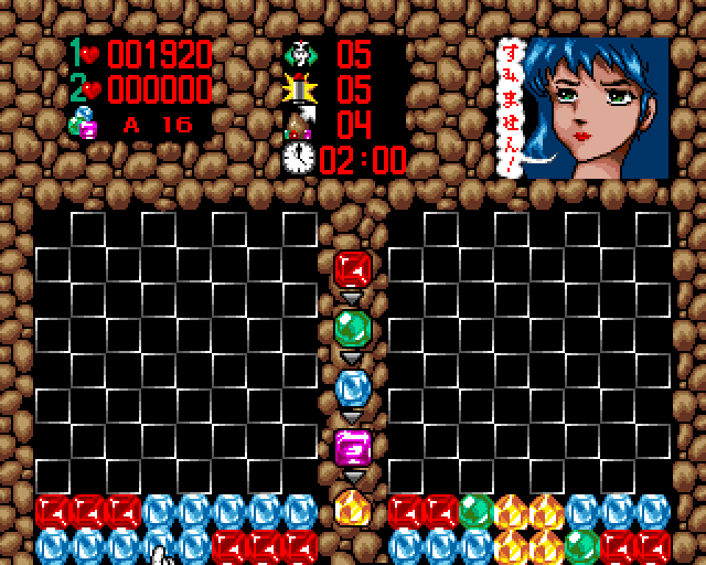 Any that move past the end fo the sequence disappear, causing surrounding blocks to drop. You get a limited number of moves, and limited time as well. Fortuantely there are passwords, delivered by cutely-drawn naked Japanese girls (although the private parts are covered up).