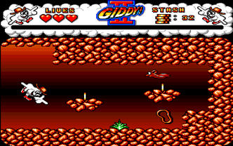 Giddy 2 is an Amiga freeware clone of Dizzy and its sequels. Intended as parody of that classic series, it also stars an anthropomorphic egg that must collect objects in order to solve puzzles. On the top screen there are three heart-shaped energy bars for the three lives of the character. If the egg touches any of the enemies, this energy bar decreases, and when it is completely drained the egg explodes with an onomatopoeic "SPLAT!", and the player loses a life. On the top-right side there is the accumulated number of coins collected by the character. Below both items is a black strip that displays the inventory content when in use mode (pressing the space bar enters the use mode, where the player moves the joystick left or right to cycle through the assembled inventory, and hits fire to use the selected object).