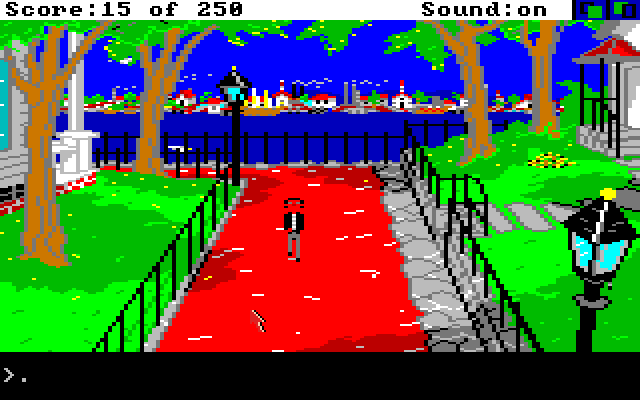 Released late into the lifespan of Sierra's AGI engine, Gold Rush! features some tricks not seen before the more advanced SCI engine, such as enlarged characters, but it is best known for the three routes available to reach California: by land, travel by boat to reach the Atlantic shore of Panama, cross the isthmus, and then get a second boat in the Pacific shore, or making the dangerous all-boat trip by Cape Horn. Each route has its dangers: Cholera might strike as you make your way across the Northern states or your boat might sink. As usual with Sierra adventures, instant killing happens if the player is careless, but will also happen at random. Other important (and innovative) concept is the game being timed. If Jerrod takes too long to leave Brooklyn, passages to California increase in price, and his house devalues. |