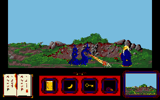 The Golden Path is a point and click adventure game. Instead of using verbs like in Maniac Mansion, the player controls the monk with the mouse by moving a cursor shaped like a Chinese letter and clicking directly at him on the screen. Left-clicking on a spot on the ground moves the monk towards it. Left-clicking below Y'n Hsi makes him bend over to drop or pick objects on the ground. Left-clicking above his head makes him try to use the object he is holding at the moment (if it is not possible to do so, a question mark appears). Right-clicking makes him punch and kick, his defense against enemies. Every time the monk is hit, the inventory briefly flashes. A book sits at the bottom-left of the screen, and serves as a hint system of sorts. When clicking on it, a message about the screen appears with explanations to events, characters and objects. Besides the book is the inventory with four slots for objects. Left-clicking on an object places it on Y'n Hsi hands. Above the inventory is a slowly withering vine as the energy bar. It grows with the completion of certain tasks.