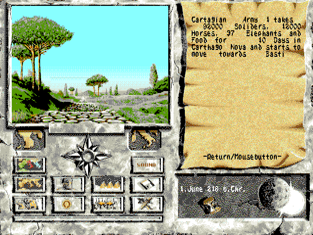 In this turn-based game you play a role of Carthagean warlord Hannibal in his struggle with Roman Empire. Managing resources derived from mines and rised by economy, you recruit armies (people, horses, elephants), siege cities, win the battles, and expand your influence from Africa to Europe.