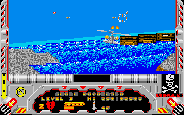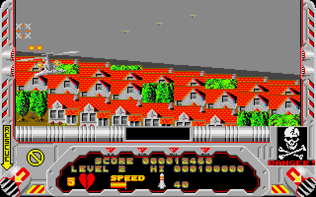 The action is spread over day and night levels, across different types of terrain. On each level you must destroy a set number of aircraft to move onto the next level - otherwise the level loops back to the start. Extra lives can be collected throughout, and your plane is armed with smart bombs to use when the action is especially hectic.