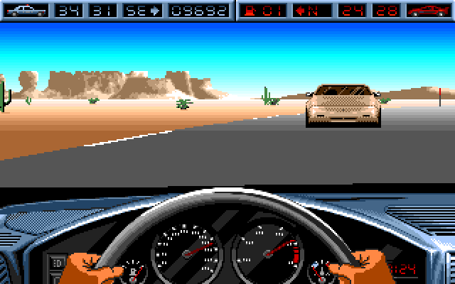 Players chase the criminals and must get them to pull over by using intimidation (siren) or force (shotgun). Players navigate to the criminal's whereabouts by use of the compass and map. Chasing the villain often means venturing off the road and driving through the desert. Traffic is the most obvious hazard in the game, contact with innocents cost promotion points. Other difficulties include: a flat tire, gangsters shooting back, running out of gas, or engine failure due to heat.