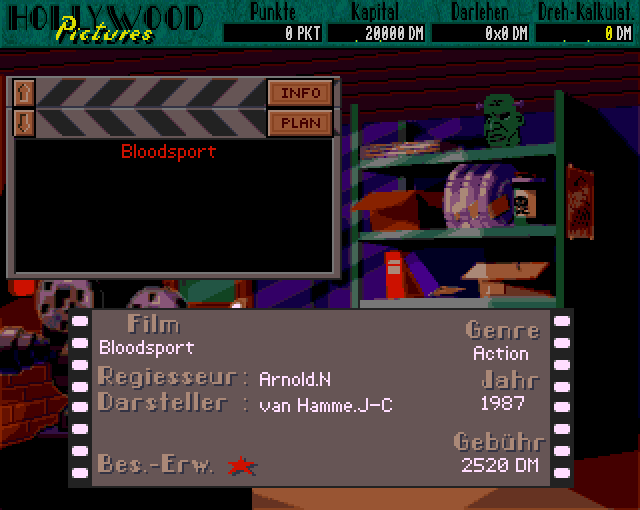 With 20000 dollars in your pockets and a cinema with 5 movie rooms you are starting to make a great movie maker career. First you buy some old, real-named movies (for example Star Wars, Evil Dead, etc) for showing them in your cinema. You can fix the prices for the tickets individual. Each movie room can have up to 5 performances a day. When you earned enough money you can do some more interesting things. Producing your own movie. Either you buy a shooting script or you make your own one by clicking some pretended words and choosing a film genre. After this you must select some actors and a director for your forthcoming blockbuster. At least you look for the locality, special effects, film music and more things. After all your movie will be rated by a jury and earns (it is to be hoped) your capital for the next blockbuster.