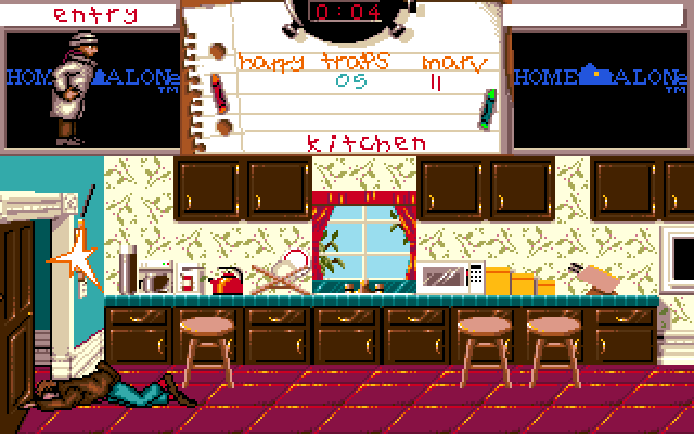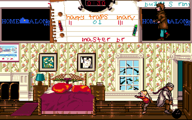 The player controls Kevin through the mansion in a side perspective. He has one hour before the burglars will break into the house. In this hour, the player has to set up various traps in order to make the burglars give up on capturing Kevin. After this hour, the burglars break in, and the traps become active. Each trap deals 5 damage to a burglar, and the first shot of Kevin's BB gun deals another 5. During this phase, the screen always tells in which room each burglar is at the moment. The game is won by dealing 50 damage to each burglar.
