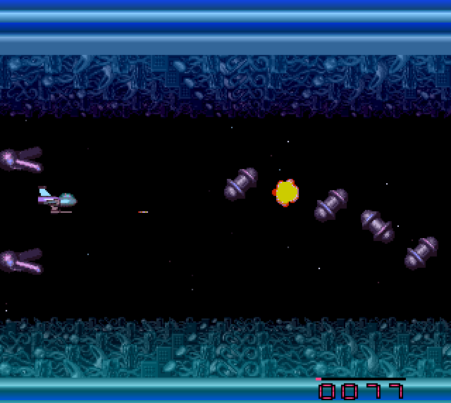 Inferior is a side-scrolling space shooter for up to two players.Moving constantly to the right the player must destroy or avoid numerous incoming obstacles waves. The ship may be controlled in each direction. Being at the left edge of the screen, backing the ship slightly slow down the action. Each of five available can be improved between the zones, for example by mounting rapidly firing cannon, increasing maneuverability or speed. Each of three zones is divided into three individual stages.