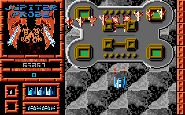 As you can probably tell from the above, this is yet another shoot ‘em up game. In fact it is very much like many other games of this type. Vertical scrolling, nice bold graphics, neat soundtrack, lots of aliens and plenty of action. The many craters, mountains, rivers (on Jupiter!!!?) and ground bases are all well drawn and very colourful, however they appear to be very 'chunky'. The sound is, in most respects, excellent.