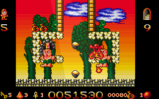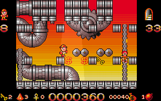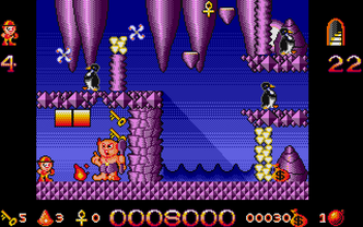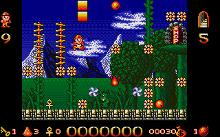 The levels feature an assortment of enemies to kill, including snakes, elves and crocodiles, as well as flames and spinning wheels. Many of these appear during the level, forcing you to plan for them. You have 10 lives, but the loss of one resets the level to its original state. The initial coin-throwing is pretty weedy, but better weapons (as well as extra lives and smart bombs) can be bought in the shop, which appears every 5 screens.