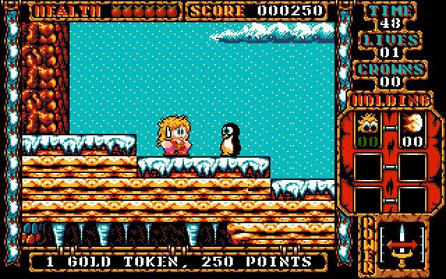 Once killed most release things like tokens, keys (sometimes required to open end-of-level doors), apples (for extra energy) and occasionally poison. There are lots of semi-hidden sections and bonus areas to find and explore, including bonus arcade games and fruit machines. Every world ends with a boss.