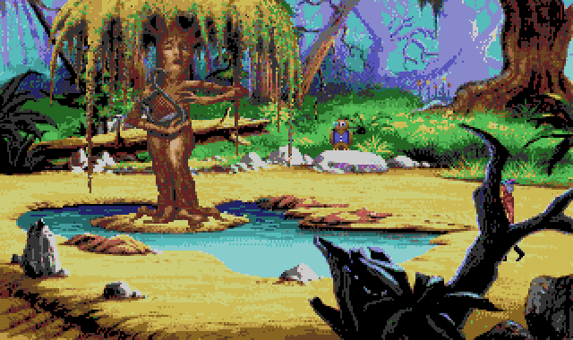 King's Quest V: Absence Makes the Heart Go Yonder is an adventure game, and the first from Sierra to use a point-and-click mouse interface. Rather than typing commands on a keyboard to interact with the game world and use the arrow keys to walk around, King's Quest V instead simplifies all actions down to base commands. To access the different cursors, the player can move the mouse to the top of the screen, revealing a hidden menu with each of the different actions, as well as game options and the inventory bag. By clicking the "Walk" cursor on the screen, Graham will walk as close as he can to the appropriate area. Clicking the "Eye" cursor on items will provide a description, the same as typing "Look at". The "Hand" cursor is a multipurpose cursor that can be used to push, pull, interact with and pick up objects. The "Head" cursor is used to talk to people (and in the strange world of King's Quest, often objects and animals, too). Players can also right-click to cycle through the different available cursors. Inventory that Graham picks up now gets placed into a bag. By clicking on the bag, this opens up a sub-window that displays all the inventory that Graham currently has. In here, players can look at or interact with objects, combine them with other objects, or pick them up to use them in the game environment as another cursor.