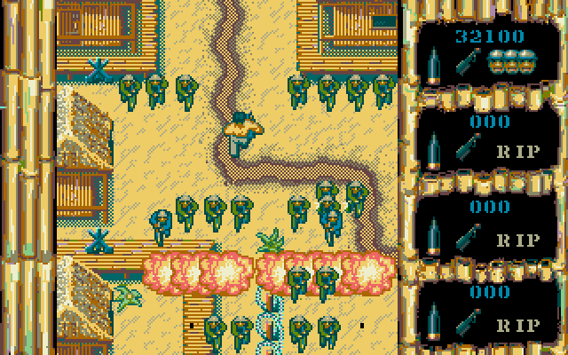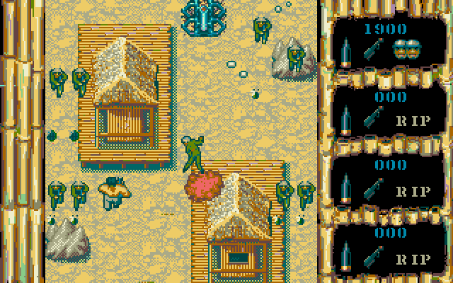 A squad of four tough-guy soldiers have to take out some foes in a jungle. As the game starts, four soldiers are depicted, with any who are not present to play killed immediately - a joystick adaptor is required for 3 or 4 player games.