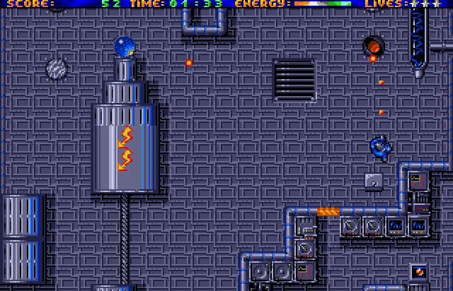 From an overhead perspective, the player controls MacGibbons through the corridors and rooms of the ship, scrolling in multiple directions. Despite controlling a human instead of a ship, the game is a straight shooter: using a gun to kill everything that moves while dodging enemy attacks and bullets. Getting hit reduces the energy bar and when it reaches zero, a life is lost. Special symbols give advantages when picked up, like extra time on the time limit, extra lives or weapon upgrades.