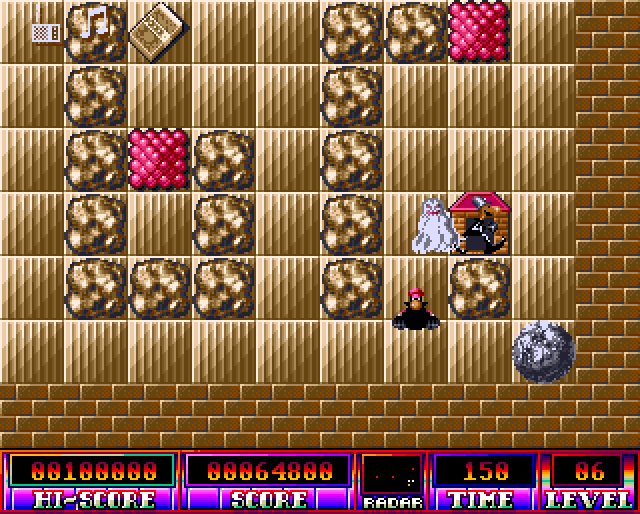 In this top-down puzzle oriented game you have to help Leonardo, a little thief, on his criminal trips. Use your joystick to lead Leonardo through 50 different levels including banks, museums, and warehouses. Pressing the fire button of your joystick you can push everything in your way, except walls. Pushed objects won't stop until colliding with other objects or the police officer and his ghost deputy whom are trying to stop your robberies. Every level has a time limit in which you must bring three equal items into one line to complete the level. Each level is larger than the screen, in the lower half of the screen you have a helpful radar for orientation. Running out of time or being caught by the police-men will cost you one of your five lives.