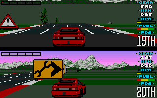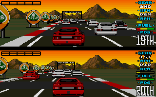 When racing in the one-player mode, the bottom half of the screen is unused and features a static image of the Esprit Turbo. In the two-player mode one half is used by each player. The two-player feature operates similarly to the one-player mode, except that only one player needs to reach 10th place to qualify both players for the next race.