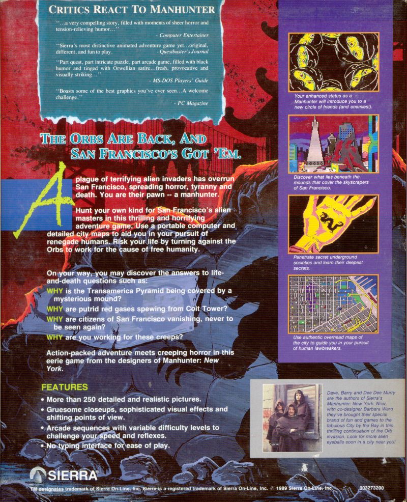 | description | Manhunter 2: San Francisco is a post-apocalyptic adventure game published in 1989 by Sierra On-Line. It is the sequel to Manhunter: New York. |