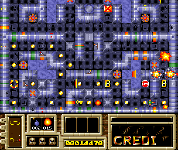 As you progress through the arenas, there are new challenges which you must face such as multi-level arenas, locked doors and passages, slippery surfaces, and much more. Also scattered throughout the arenas is the letter "B", which when collected will award you a letter that make up the word CREDIT. When you have formed the word, you will be awarded an extra credit. Besides the standard arenas, there are also speed arenas, which are more difficult than the others. The object of these arenas is to get past more obstacles and gather as many coins as you can before the time expires.