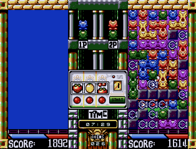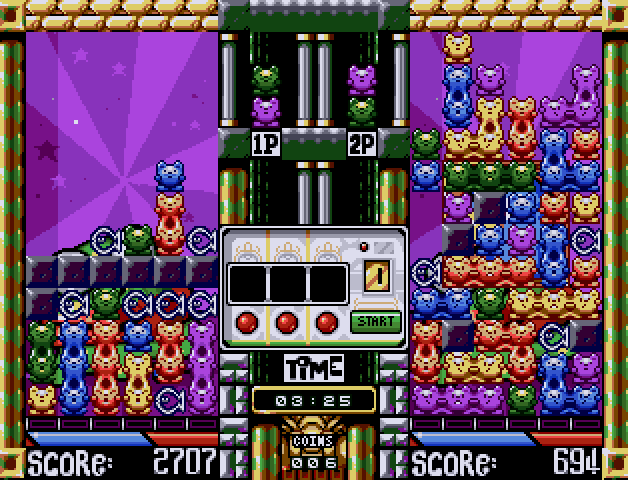 Minskies Furballs is not a port, but a spiritual clone of Puyo Puyo. In a tournament against a cast of crazy characters, you must guide and rotating falling pairs of cats of different colours to make up colour combinations. When four or more cats make contact, they are eliminated, and those above fall down, thereby possibly triggering a chain reaction. Chain reactions will make fish and boulders fall down into your opponent's playfield, blocking his progress. Eliminating blocks will sometimes give you special weapons which can be used to eliminate cats and blocks from the screen.