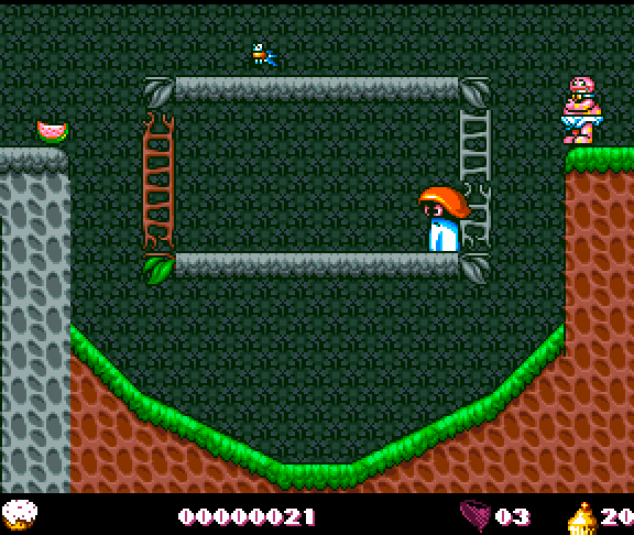 Basically a remake of the SNES game Super Troll Islands, but superficially incorporating TV character Mr Blobby, who was famous for crushing people and shouting "Blobbitty Blobbitty Blobby" or words to that effect, neither of which he does in the game. It's essentially a platform game, but the 60 levels are reliant on you colouring in enough of the screen, by walking over it. Power ups are on offer, and the levels include some interesting design features, including ladders, spikes and springs to bounce off. You can switch between the 3 characters (Mr Blobby, Mrs Blobby and Baby Blobby) at any point, and only lose once all 3 are out of lives. There are plenty of bad guys around, all looking identical and following pre-programmed attack paths.