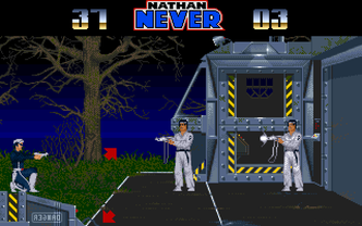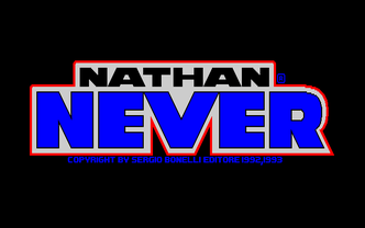 Nathan Never is a 2D (with many parallax scrolling layers) side-scrolling run and gun arcade game, based on an Italian comic series. The player controls Nathan Never - a special agent in a dystopian future. He goes between various locations, avoids and shoots enemies, jumps over obstacles/holes etc. The game has several "adventure" aspects - Nathan Never can search bodies and talk with people (in Italian - the normal part of the interface is in English).