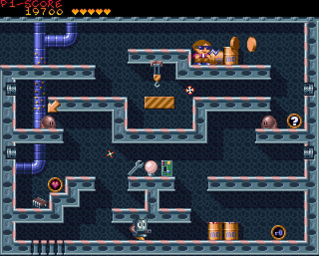The Naughty Ones come under your control in this old-fashioned platform game. Each screen is separate from the others, and involves trying to collect a key and then progress through the exit. Enemies are best dealt with by shooting one of your longer-range weapons towards them and waiting for it to hit them - this will release at least one coin, for points. Improved weapons can be collected, each of which functions for a limited number of shots. Bonus items are often located in the more precarious parts of the level, leading you to choose whether to risk losing a life, and going back to the start of the screen (although previously killed creatures remain dead when you lose a life).