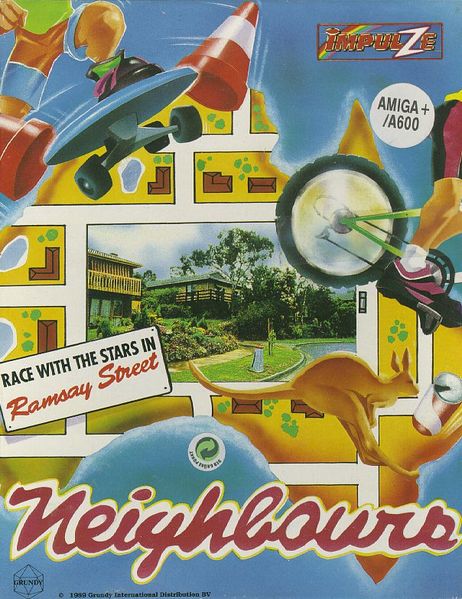 | __long_description | This racing game is set in the Ramsay Street universe of the Australian soap opera, which was hugely popular in the UK at the time. Nominally you play Scott Robinson, riding his skateboard in races against between one and four fellow characters – Mike Young on another skateboard, Charlene Ramsay in a go-kart, her brother Henry on a lawnmower, and Matt Robinson on a motorcycle. The eight races take in Ramsay Street, the Lassiter’s Complex, Erinsborough High School, and Anson’s Corner. There are three boards available (two on the Spectrum), trading top speed off against manoeuvrability.