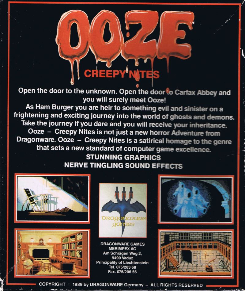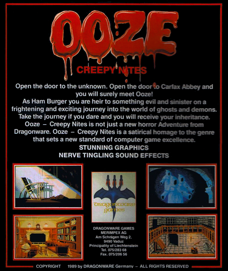 | description | Ooze - a illustrated text adventure: Your uncle Chez Burger left you a house called Carfax Abbey, placed in a little town in the southeast of Salom's Lot. As Ham Burger you are heir to something evil and sinister on a frightening and exciting journey into the world of ghosts and demons. |