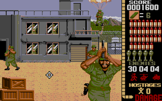 Operation Wolf is an arcade game by Taito. It is essentially a bitmapped "rail-shooter", where you basically hold the gun and shoot just about everything that moves, while conserving your ammo and grenades. Shoot ammo/grenades and healing items on the screen to "pick them up". Your primary machine gun can kill everything if you hit it enough times, but you can also use the grenade launcher for really deadly targets like helicopters or armored cars. You can collect a machine gun which will allow you to shoot faster for a few seconds.