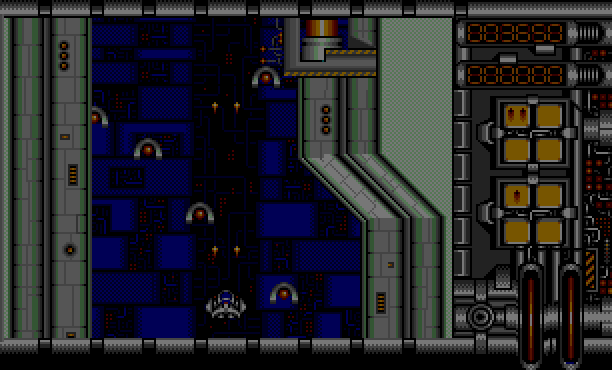 The game can be played with two players simultaneously. Several extra weapons can be gathered on shooting enemy ships: shields, extra lives, double fire which double your shooting power, weapons that fire to the side and many more.