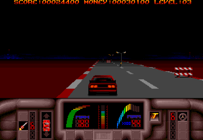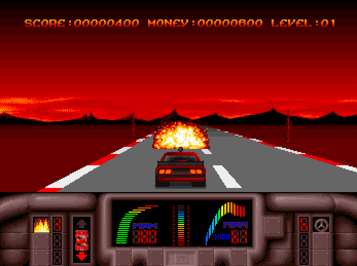 The undulating road's quite good, but other than that the graphics are bland and badly animated with poor collision detection. Complementing them perfectly, the simple roadblasting gameplay will drive you mad with boredom.