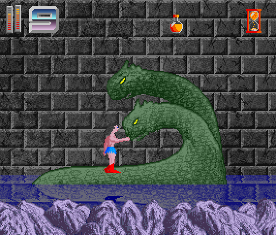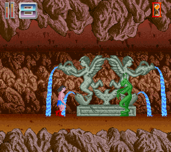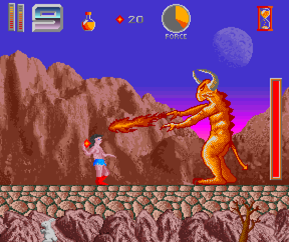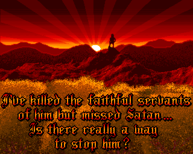 The plot follows John Milton's poem from 1667 loosely. You begin your quest to defeat Satan in a cave where you fight various normal and some mid and end level bosses. Afterwards you exit the cave to enter level 2 that leads you through an open area with bridges that is quickly passed. In the next level your goal is to defeat twenty evil creatures and obtain their souls as an ammunition that you'll use against Satan himself. This level is presented in a third person perspective in contrary to the other horizontally scrolling levels. After you've collected the twenty souls, you fall through a hole in the ground to face a hydra. Once you defeat the hydra you finally enter the last stage in which you face Satan himself after a short stage with a Greek ambiance.