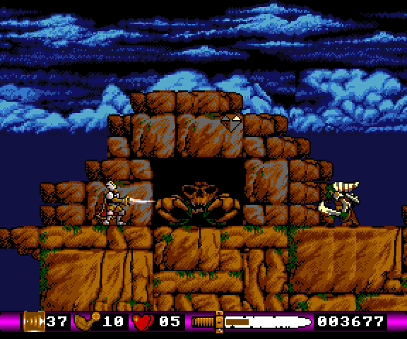 Each world has 10 levels, and half of them are played flying on Pegasus back, and the other half walking, without your magical horse. When flying, the game plays like a Shoot'em up, but when walking, it's a platform game, and you have to rely on your sword.