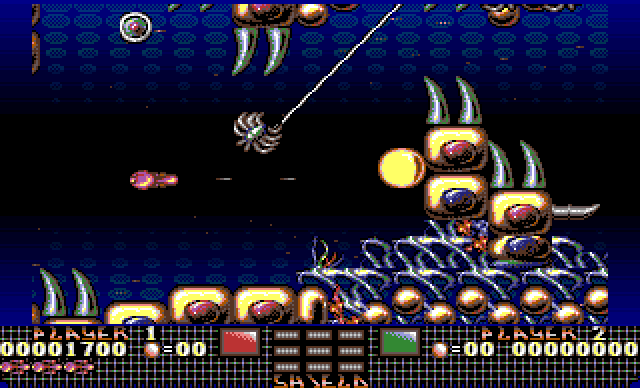 The action is mostly one-dimensional blasting, but with distinct sections of flying to a level, flying around it, and then navigating an underground cavern. A simultaneous 2-player mode exists to make things a little less daunting.