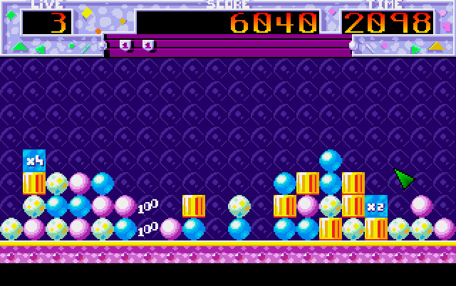 Pick 'n Pile is a Tetris-style puzzle game. On each level there are a variety of symbols arranged in columns on the screen. By moving the symbols around, you need to create columns which contain identical symbols; once all the symbols in a column are the same, that column disappears. Your goal is to earn points and complete the levels by making all of the symbols on the screen disappear. Occasionally, you may become stuck with a symbol that doesn't match anything onscreen; when this happens, you can call for an additional symbol to drop onto the screen. However, as the symbol which appears is random you may need to create quite a few symbols before the one you need appears. Each level has a time limit in which it needs to be completed; run out of time and you lose a life; lose all lives and the game is over.