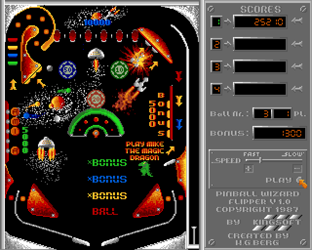 Pinball Wizard is a German pinball game with one non-scrolling table. As usually, the goal is to use the three paddles to keep the ball as long as possible from falling off the screen. Hitting things on the playfield rewards points for the high score list which is saved on the disk. The table also features some additional extras to discover, e.g. hitting a certain spot when the letters "AMIGA" are glowing activates a multi ball. Also included is the option to influence the ball's direction by nudging the screen - but this eventually leads to a tilt.