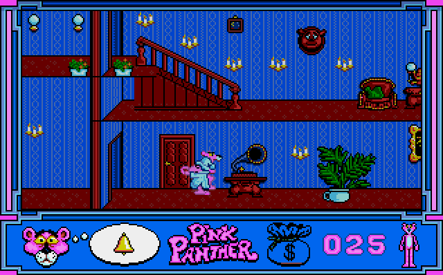 The game is a sidescrolling adventure and takes mostly place in the house of the employer. Pink Panther can himself move freely in the house, but at the same time he needs to keep his eye on the sleepwalker, so that he can prevent him from stumbling on various objects, such as rugs and tables.