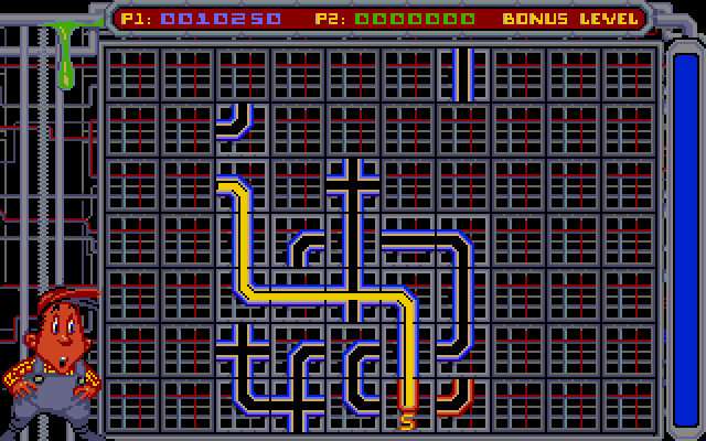 Bonuses are awarded for looping the flooz through both sides of at least 5 cross-over pieces or passing the flooz through every square on the screen. Later levels have some squares on the grid blocked off, a few gaps in the side-wall (allowing flooz to thread to the other side of the screen). After every four levels, there is a bonus game for points, in which the player can only place the pieces in the lowest open space in each column, similarly to the board game of "Connect 4". |