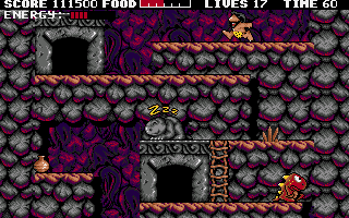 Prehistorik is a side-view platform game with a superficial similarity to Chuck Rock. You control a neanderthal who must march through hostile pre-historic environments seeking food and keeping himself safe. Some food can be found in caves, but it mainly exists in living animal forms.