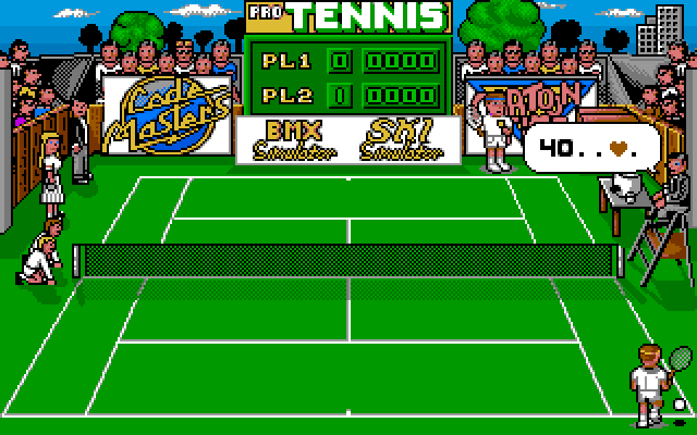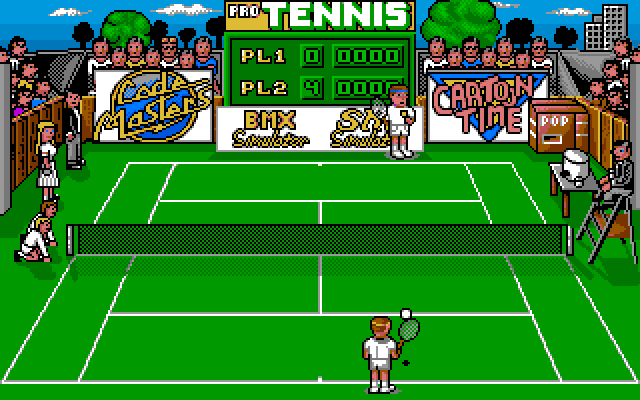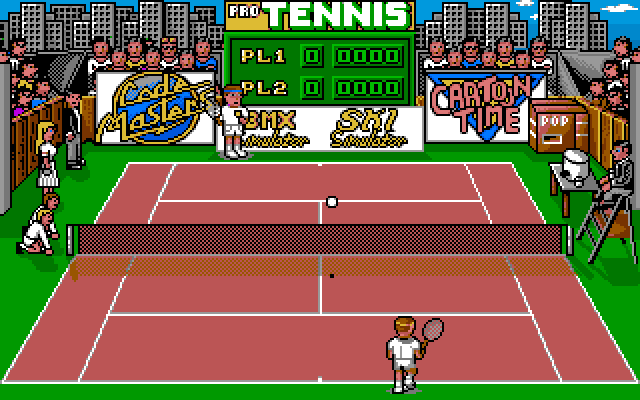 This tennis game offers bare-bones action for one or two players. There are 3 computer skill levels on offer, and matches can be 1, 3 or 5 sets. The gameplay is viewed from above and behind the net, with a slight 3D effect. The type of shot played is determined by how high the ball is as you hit it. The full service rules are implemented, and the fire button must be pressed once to throw the ball up, and a second time to hit it with the racket.